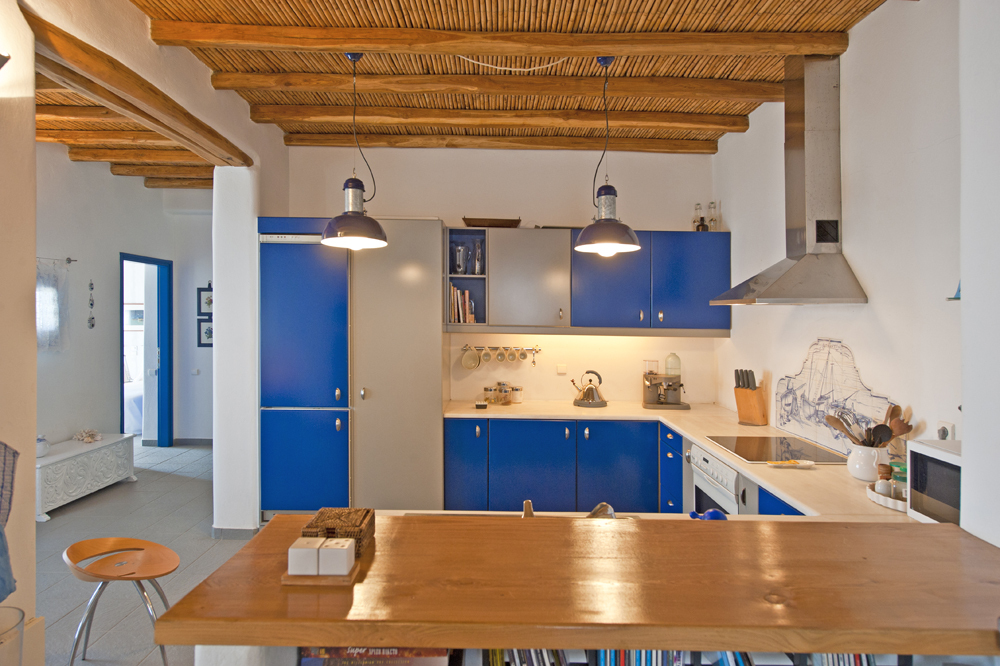 The house, built with the typical Cycladic architecture, comprises of three levels and a terraced well-kept garden. A spacious outdoor terrace shaded by a traditional Greek pergola surrounds the main entrance floor. The main entrance opens to a cozy indoor living area with sitting place, a large dining table decorated with contemporary art pieces. There is also a well-equipped open-plan kitchen with a comfortable bar area. Located on the same floor is the main guest bedroom with twin beds (pushed together can create a double), with access to the terrace with sea views. The upper floor is dedicated to the master bedroom with a large en-suite bathroom, and access to a spacious roof veranda with great panoramic views.