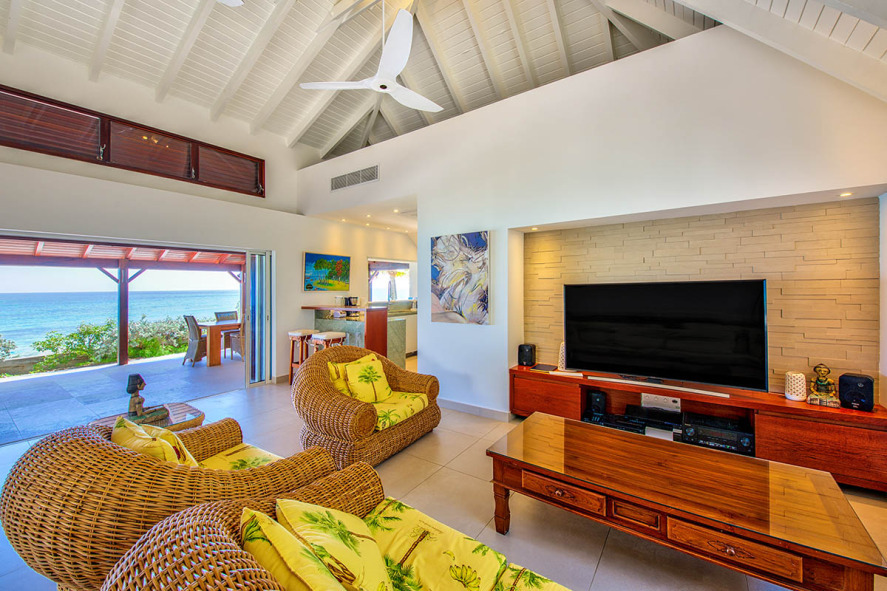 The main building on the property houses the newly-refurbished living area offering fabulous ocean views, air-conditioning and a flat-screen TV with Netflix. Large glass sliding doors open out to a large, covered, beachfront terrace with additional seating and a large dining table. The inviting seafront gazebo offers an additional dining option. A brand new kitchen has lovely ocean views from the breakfast bar and offers high quality appliances including an induction oven and wine cooler.
