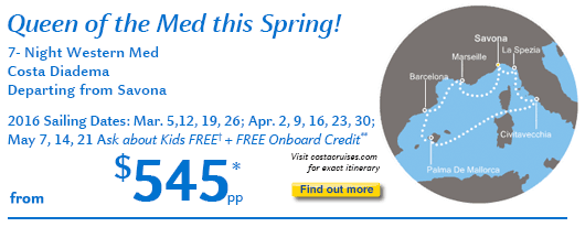 Check out our Med cruise sailings this spring and see what is possible with these incredible offers. Remember, our FREE Onboard Credit** program is flexible and can be used for spa or beverage packages, shore excursions, WIFI or the gift shops, allowing you to Costa-mize your onboard experience however YOU choose. Don't delay, the 14th is just around the corner!