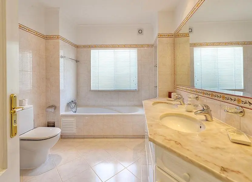 Bedroom 1 (First Floor): Master double bedroom with a balcony where one can sit and relax with views of the pool, garden, golf course, and lake. It has an en-suite bathroom with bath and shower