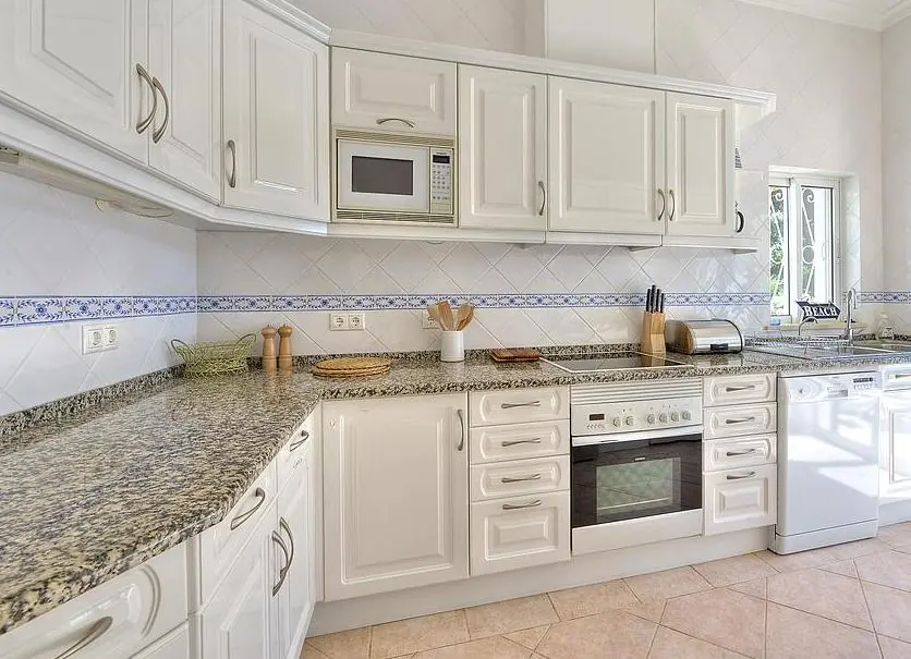 The kitchen is modern and fully equipped with electric oven and stove, toaster, coffee machine, dishwasher, washing machine, and dryer. There are four bedrooms: two doubles, one twin and one single.