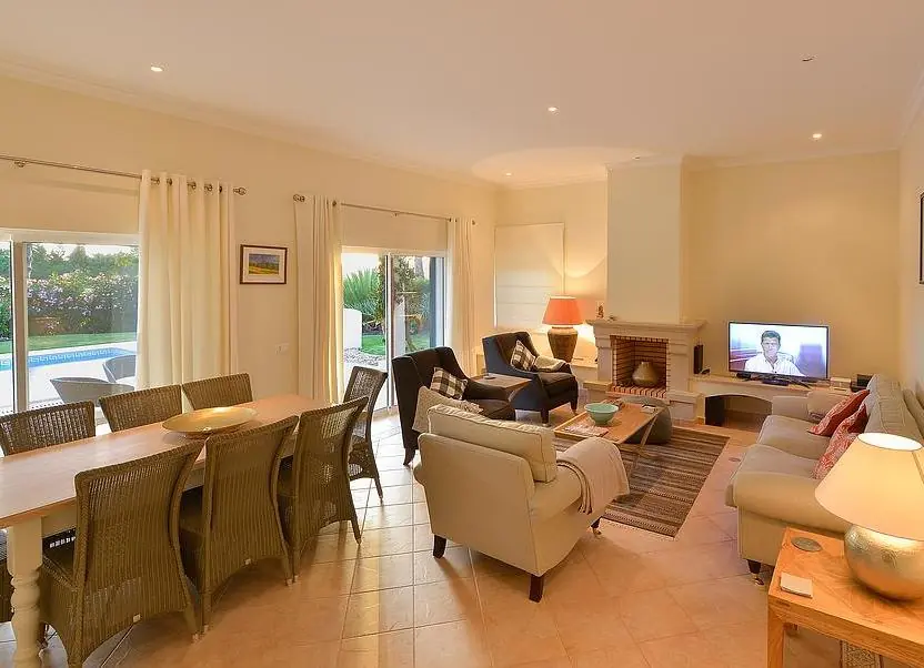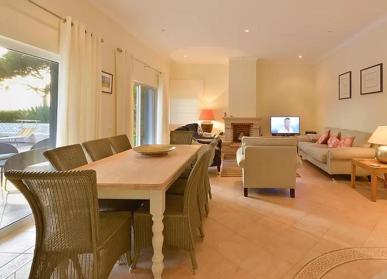 The living room includes a 3D TV system, cable with many UK channels, X-Box, and media center. A sliding door leads out to the pool terrace and the dining area is open plan with a dining table for eight guests.