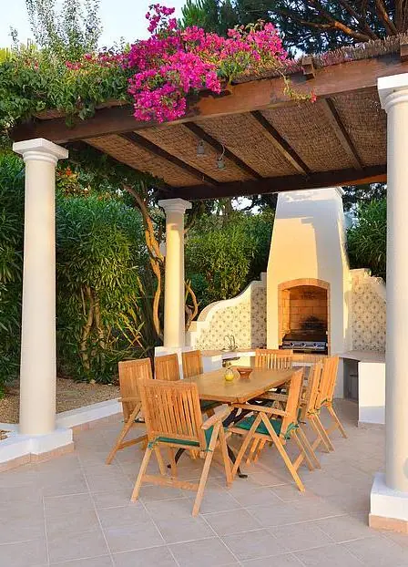 Outside is the dining terrace with a dining table and a gas barbecue. The private pool is 10 m x 6 m approximately with ladder and steps and it can be heated at extra cost. There are eight loungers and two sun umbrellas.