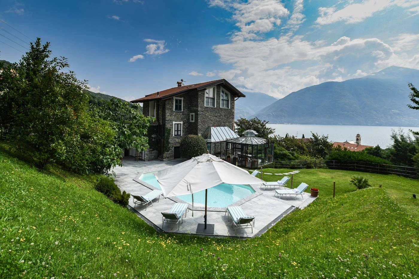 Here, one can enjoy majestic landscapes, calming serenity, and a sophisticated atmosphere. It is very difficult to resist the charm of the lake – the same charm that inspired many celebrities to purchase property along its shores. Diranda is located just a six minute drive north of Menaggio — one of the many cozy towns with a buzzing dining, entertainment and shopping scene, and a convenient public ferry terminal. Perched on a hill, the villa reserves a vibrant welcome to its guests with breathtaking views over the lake.