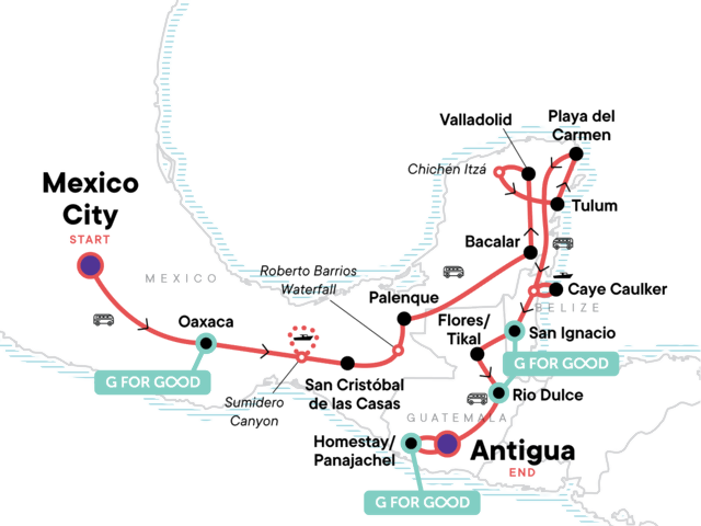 Your Big Night Out Moment: Antigua Guatemala. Mexico City street food crawl. Alebrijes Artisan Community visit. Boat trip to Sumidero Canyon. Stop at Roberto Barrios Waterfall for a swim. Tour the Mayan ruins in Palenque. A boat adventure into a gorgeous lagoon in Bacalar. Chichen Itzá ruins guided tour. Guided tour of Tikal. Orientation walk in Antigua. Beach time in Playa del Carmen and Caye Caulker. Free time in Mexico City, Oaxaca, Palenque, San Cristóbal de las Casas, Playa del Carmen, Caye Caulker, and Antigua. All transport between destinations and to/from included activities.