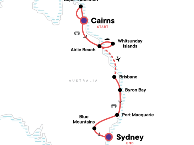 Your Welcome Moment: Welcome Moment - Meet Your CEO and Group. Guided rainforest walk. Whitsunday Islands boating excursion. Blue Mountains stay with hikes. Scenic Railway. Jamison Valley walk. Orientation walk in Sydney. Free time in Cairns, Byron Bay, and Sydney. Internal flight. Surf lesson in Byron Bay. All transport between destinations and to/from included activities.