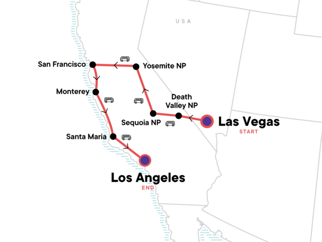 Hike in Death Valley; the U.S. national park with the lowest elevation, Wrap your arms around the biggest trees in the world in Sequoia National Park, Witness breathtaking views of Yosemite National Park, Sightsee your way down the coast's famous Highway 1 from San Francisco to Los Angeles stopping in Monterey and Santa Maria.
