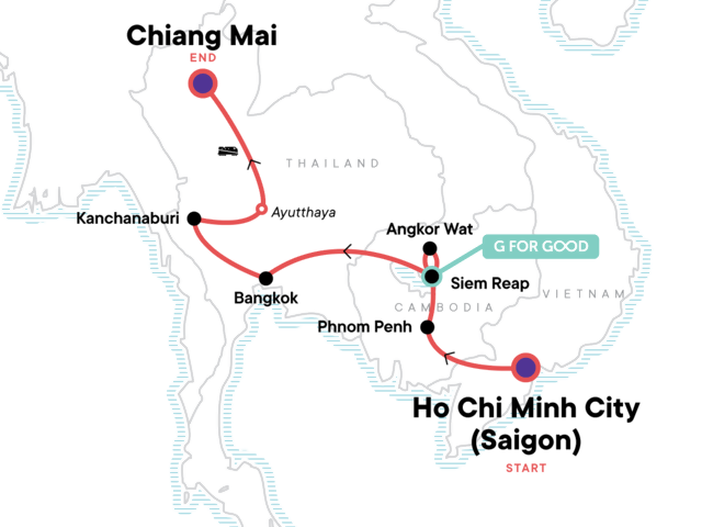 Your Discover Moment: Bangkok. Mekong Delta day trip. Cyclo tour (Phnom Penh). Tuol Sleng prison and Choeung Ek (Killing Fields) entrance and guide. Two-day Angkor Wat complex entry and guide, including sunrise tour. Wat Pho visit. Klong riverboat tour. Erawan Falls and Bridge on the River Kwai visit (Kanchanaburi). Thai-Burma Railway Centre and Allied War Cemetery visit. Temple ruins tour (Ayutthaya). Doi Suthep temple visit (Chiang Mai). All transport between destinations and to/from included activities.