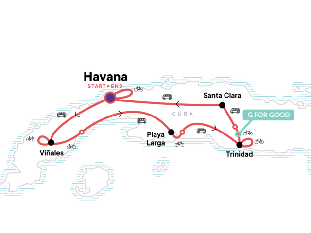 Your Hands-On Moment: Salsa Lesson, Trinidad. Arrival transfer. Guided cycling with support vehicle. Traditional cigar factory visit in Pinar del Río. Cueva de los Portales visit. Las Terrazas visit. Giron Museum visit. Che Guevara's Mausoleum Visit. Havana city tour. Informal Spanish lesson. All transport between destinations and to/from included activities.