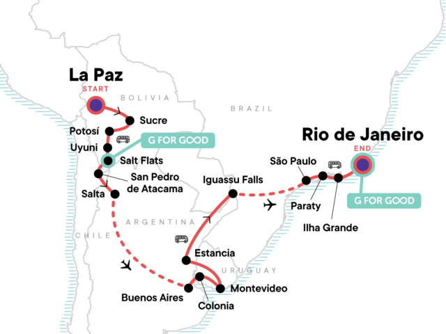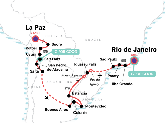 Night 2: overnight bus, Nights 8-9: Salar de Uyuni, Nights 14-16: Buenos Aires, Nights 20-21: Estancia, Night 22: overnight bus, Nights 29-30: Rio de Janeiro.