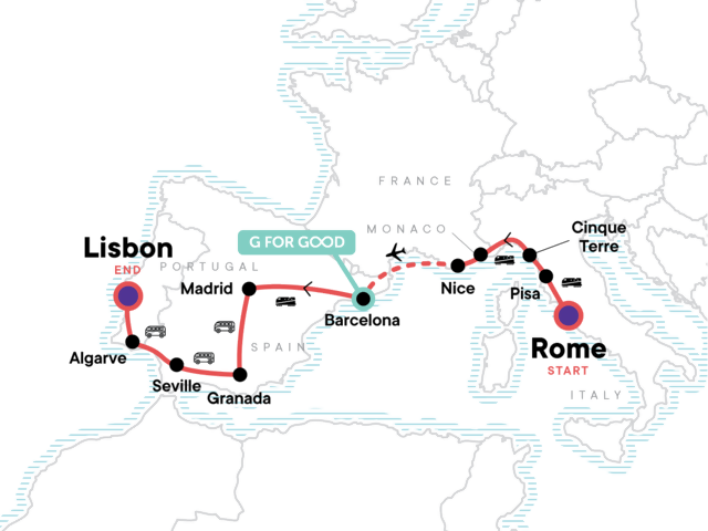 Your Big Night Out Moment: Lisbon. Visit to the Leaning Tower of Pisa. Cinque Terre park fee, unlimited train ticket, and CEO-led hike. Visit to Monaco. Tapas bar crawl (Granada). Free time on the Algarve coast (Portugal). Orientation walks in Barcelona, Granada, Lisbon, and Madrid. All transport between destinations and to/from included activities.