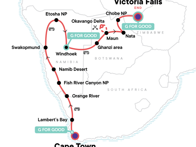 Your Discover Moment: Swakopmund. Fish River Canyon entrance. Sossusvlei Dunes and Sesriem Canyon entrance. Wine tasting in Lambert's Bay. Etosha National Park entrance and wildlife safari drives in our vehicle. San/Bushmen walk. Traditional dinner. Okavango Delta overnight bush camping excursion. All transport between destinations and to/from included activities.