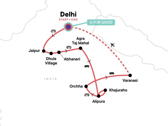 Your Welcome Moment: Welcome Moment - Meet Your CEO and Group. Old Delhi walk with stops at the Jama Masjid, Gurduwara, Chandni Chowk, and Connaught Place. Amber Fort tour. Rajasthani rural village stay. Village cycling excursion. Abhaneri stepwells visit. Taj Mahal and I’timad-ud-Daulah (Baby Taj) entrance. Agra Fort entrance and guided tour. Orchha Palace complex visit. Western Temple complex entrance and guided visit. Ganges River boat trip at sunrise and sunset, including candle flower ceremony. Internal flight. All transport between destinations and to/from included activities.
