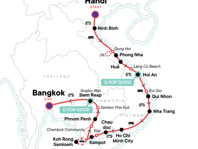 Enjoy street food crawls and free time in Hanoi and Ho Chi Minh City, Sample Oodles of noodles and visit riverside bars in Hoi An, Take a thrilling cyclo-tour trough Phnom Penh, Hit the beach at Qui Nhon and Koh Rong island, Descend into the remote Vinh Moc Tunnels, Explore the Mekong Delta and Sam mountain by motorbike, Embrace daily life at the floating markets of Chau Doc and not-so-daily life at Skun spider market, Join the street party in Bangkok