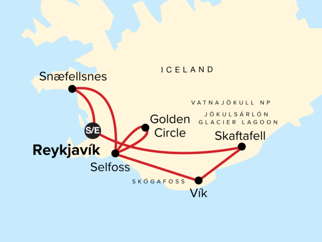 Your Wellness Moment: Krauma Spa and Geothermal Baths, Reykholt. Seljalandsfoss waterfall. Visit the LAVA Centre. Hveragerði geothermal garden. Visit Jökulsárlón Lagoon. Take an ice walk on a glacier in Skaftafell National Park. Visit black sand beaches. Explore Vatnajökull National Park. Golden Circle tour including Thingvellir National Park, Gullfoss waterfall and Geysir Hot Springs. Explore Snæfellsnes Peninsula including Snaefellsjokull National Park, Sagaland and Deildartunguhver Hot Spring. All transport between destinations and to/from included activities.