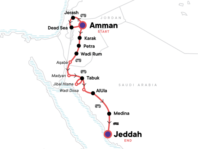 Your Foodie Moment: Jeddah City Tour, Jeddah. Jerash guided tour. Dead Sea visit. Visit Madaba mosaics and Mt Nebo. Karak Castle guided tour. Petra guided tour. Wadi Rum 4x4 excursion. Red Sea stay. Entrance fees in all included tours. Border crossing between Jordan and Saudi Arabia. Visit to Al Bad. Walk through Jimal Hisma, the Wadi Rum of Saudi Arabia. Tour of Wadi Dissa by 4x4. Visit to UNESCO World Heritage site of Hegra. City tour of Medina and Jeddah. All transport between destinations and to/from included activities.