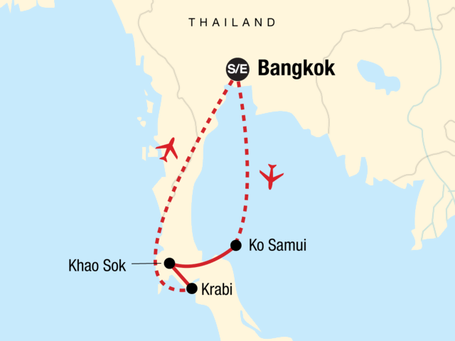 Discover the laid-back culture and stunning natural treasures of southern Thailand on this sojourn to tropical shores, from Ko Samui to Krabi. Stroll along white-sand beaches, trek through lush rainforest, and snorkel crystalline waters in the Gulf of Thailand and the Andaman Sea. Whether navigating mangrove forests by longtail boat or winding between traditional villages in a motorized tuk-tuk, experience the lesser known side of Thailand’s idyllic coastal escapes.