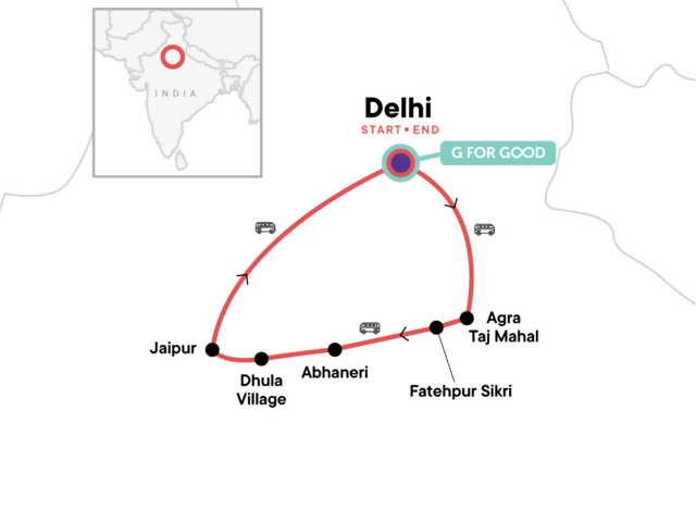 Arrival transfer included through the G Adventures-supported Women on Wheels project. Walking tour with a guide from the G Adventures-supported New Delhi Streetkids Project. Old Delhi walk with stops at the Jama Masjid, Gurduwara, Chandni Chowk, and Connaught Place. Agra Fort visit. Taj Mahal visit. Fatephur Sikri visit. Village stay (Dhula). I'timad-ud-daulah (Baby Taj) entrance. Jaipur City Palace entrance and guided tours. Amber Fort. Abhaneri village walk and stepwell visit. All transport between destinations and to/from included activities.