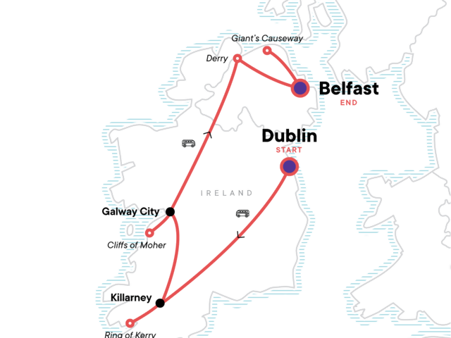 Drink a pint and listen to traditional music in a local pub, visit the sites along the Ring of Kerry, walk some of the Wild Atlantic Way to the Cliffs of Moher, explore the cities of Dublin and Belfast.