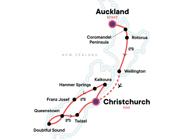 Your Discover Moment: Queenstown. Waitomo Glowworm caves visit. Orientation walk in Wellington and Christchurch. Wine tasting. Fiordland National Park visit with Doubtful Sound day cruise. Aoraki/Mt Cook National Park visit with hiking opportunity (weather permitting). Internal flight between Wellington and Christchurch. Free time in Rotorua, Wellington, Franz Josef, and Queenstown. All transport between destinations and to/from included activities.