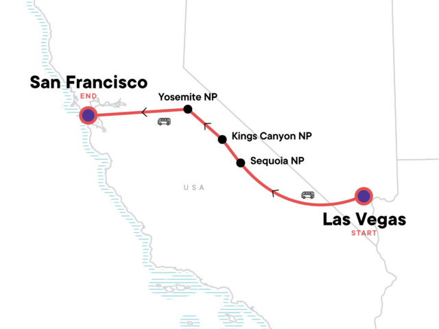 Drive from the Sierra Nevadas to the San Francisco Bay. Tour ends on arrival. Onward travel should be booked no earlier than 7pm.