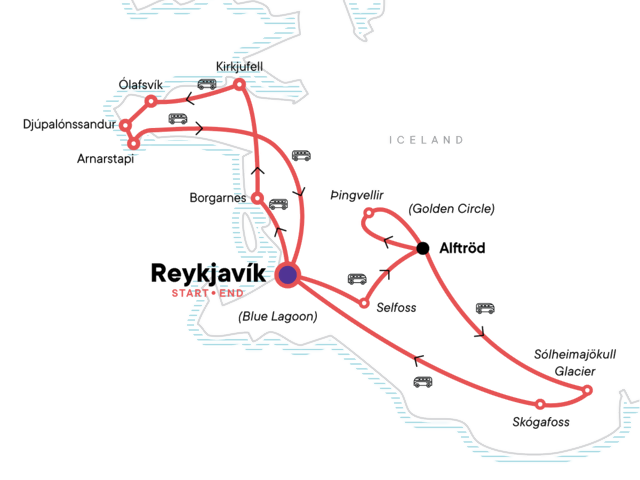 Your Welcome Moment: Welcome Moment - Meet Your CEO and Group. Lava caving (Leiðarendi Cave). Golden Circle sightseeing. Þingvellir National Park visit. Geysir Hot Spring visit. Gullfoss waterfall visit. Northern Lights viewing opportunities (2 nts). Southern coast drive including Skógarfoss waterfall and Seljalndsfoss waterfall. Day tour of the Snæfellsnes Peninsula. Sky Lagoon entrance. Reykjavik CEO-led City Tour.Transport to/from all included activities and between all destinations.
