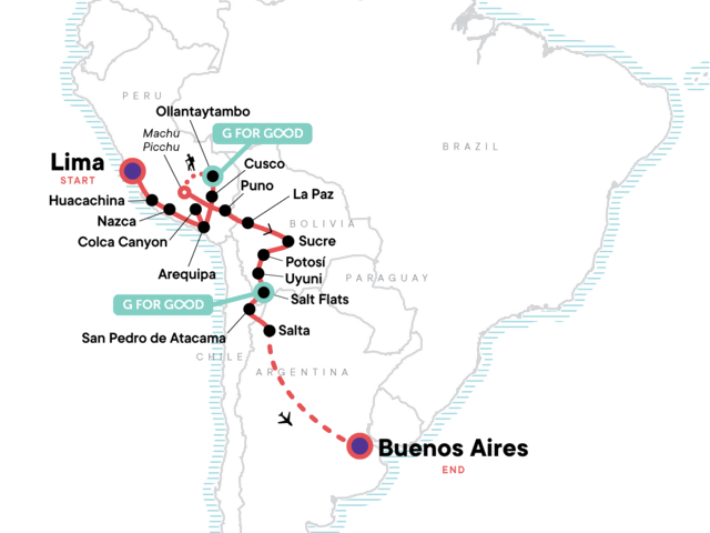 Sandboard the desert dunes of Huacachina, Spot condors at Colca Canyon, conquer the Inca Trail on the way to Machu Picchu, experience traditional life on Lake Titicaca, cross the Salar de Uyuni, the world's largest salt flat, on a 4x4 excursion, Stay overnight at a G Adventures-supported community lodge