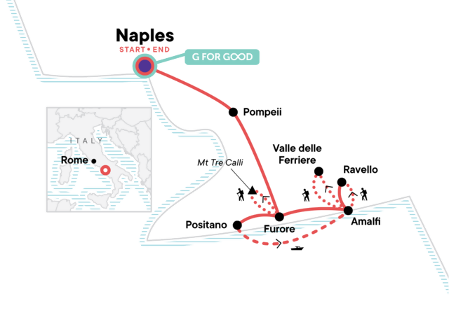 This is a walking trip, with hikes of up to 5-6 hours involving some ascents and descents of up to 600 metres (2000ft). Please be prepared in particular for some steep ascents and descents and lots of steps (both up and down) on the Path of the Gods and other Amalfi Coast walks! Be prepared for narrow paths as well, some with steep drops to one side as well. Not suitable for people with knee problems. Depending on your hiking experience, you might find that the routes used on this trip range from moderate to a bit more demanding in difficulty. All hikes are optional. At any time you do not wish to participate in any of the included hikes, your CEO can help you arrange optional, non-included day activities in the area at an additional cost.