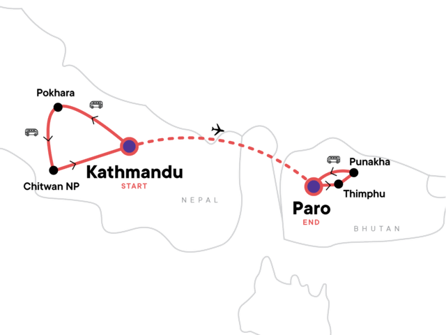 Explore the sights in old Kathmandu and Bhaktapur, Learn to make Nepalese momos from a group of local women, Search for tigers in Chitwan National Park, Marvel at the mountain landscapes, Visit various dzongs and Buddhist gompas