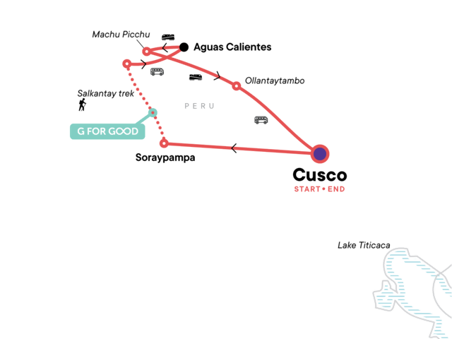 Your G for Good Moment: Handmade Biodegradable Soap Products. Trek on the Salkantay route to Machu Picchu with a local guide, cooks, and porters (3 days). Guided tour of Machu Picchu. All transport between destinations and to/from included activities.