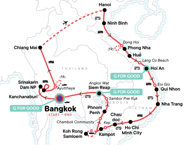 Your Foodie Moment: Ho Chi Minh City Street Food Crawl, Ho Chi Minh City. Bangkok Klong Riverboat Tour. Visit Hellfire Pass and Ride the Death Railway. Visit Bridge on the River Kwai and Thai/Burma Railway Centre and Allied War Cemetery. Visit a Local Rice Farm. Ayutthaya Cycling. Boat Tour. Chiang Mai Old Town Orientation Walk. Chiang Mai Night Market Walk. Sunrise Alms Giving. Doi Suthep Temple Visit. Hanoi Old Town Cyclo Tour. Bia Hoi Corner and Microbrewery Crawl. Hanoi Foodie Culture Tour. Tam Chuc Pagoda Tour. Dong Hoi Wet/Fish Market tour and countryside cycling. Vinh Moc Tunnels Tour. An Bang Cemetery Tour. Visit Lang Co Beach. Hai Van Pass and Marble Mountain Tour. Hoi An Old Town Walk and Riverside Evening Out. Dinner at one of the stylish restaurants in the ancient town of Hoi An. Thap Doi Cham Temples Visit. Eoi Gio Coastal Walk. Beach Time at Qui Nhon and Nha Trang. Visit Gành Đá Dĩa. Ho Chi Minh City Walking Tour including Ben Thanh Market. Karaoke Night. Motorbike tour including Hang Pagoda and Sam Mountain. Chau Doc floating market. Kep market walk. Tour of Monivong Bokor NP. Tour of Chambok Community with traditional lunch. Phnom Penh cyclo tour and dinner at one of best restaurants in Phnom Penh. Visits to Skun Market and Santuk Silk Farm. Tour of Sambor Prei Kuk Ancient Site. Visit Rong Klua Market. Visit Wat Sothorn Wararam Woraviharn. Walk and night out on Khao San Road. All transport between destinations and to/from included activities.
