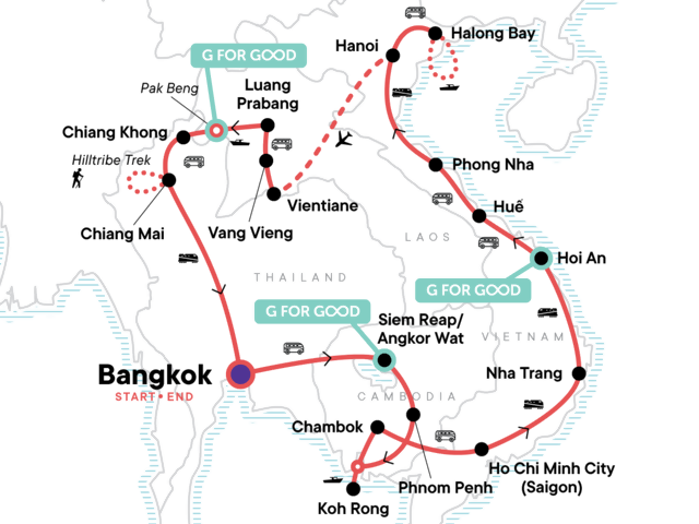 Your Big Night Out Moment: Chiang Mai Celebration, Chiang Mai. Guided sunrise tour of Angkor Wat temple complex. Orientation walks in Ho Chi Minh City, Hoi An, Hanoi, Phnom Penh, and Luang Prabang. Halong Bay boat cruise with lunch. Guided hike, sunset cruise, waterfall excursion and Sunset at Wat Phousi in Laos. Slow boat up the Mekong. Four street food crawls in different cities. Internal flight. Hilltribe trek. Bamboo rafting. All transport between destinations and to/from included activities.