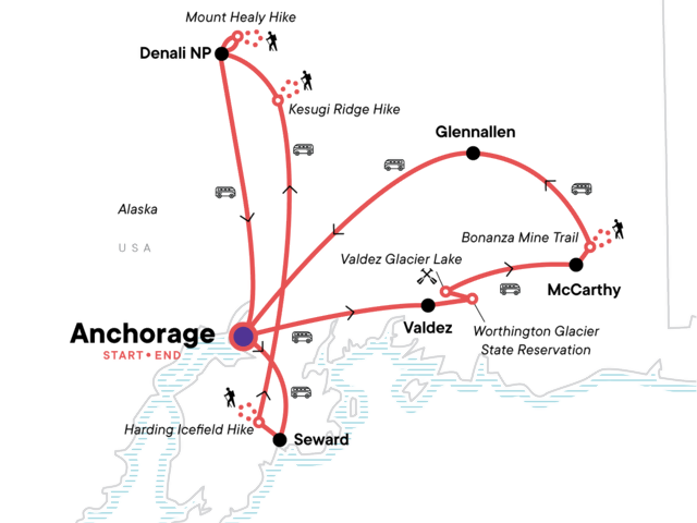 Your Welcome Moment: Welcome Moment - Meet Your CEO and Group. A visit to Churgach National Forest. A hike up Mount Marathon in Seward. Harding Icefield Hike. Talkeetna Lake Trail hike. A hike up the Mount Healy Overlook trail. Hike along Horseshoe Lake. Visit to Matanuska Recreation Site. Worthington Glacier hike. Glacier Lake guided hiking and kayaking trip. Wrangell-St. Elias National Park visit. Bonanza Mine trail hike. Copper Visitor Center trip. National Park entrance fees. All transport between destination and to/from included activities.