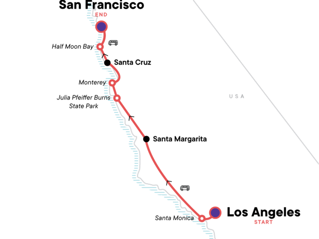 Drive up the coast from Los Angeles to Santa Margarita with stops in Santa Monica and San Luis Obispo, Check out the Elephant Seals along Highway 1, Embark on a hike through the dramatic scenery in Julia Pfeiffer Burns State Park, Make pit stops in Carmel and Monterey for some exploring, Adventure your way through San Francisco to spot all the famous landmarks.