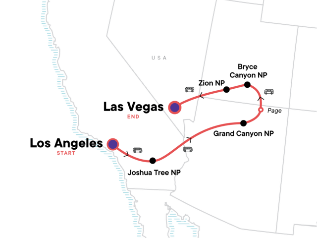 This morning opt to get in one last activity at our Glamping site if you ran out of time yesterday or simply relax in the wild surroundings. Then the group will drive from Zion to Las Vegas where the tour ends on arrival.