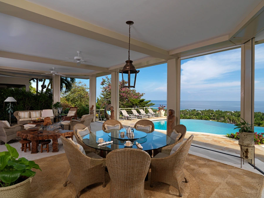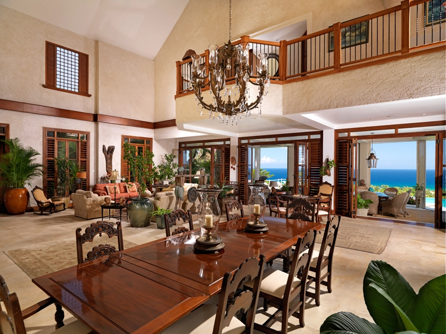 Greatview is among the best-managed and best-staffed villas in our group. A staff of 10 ensure the highest levels of service 24 hours a day. Our expert chef presents exquisite meals from the state-of-the-art kitchen with six-burner commercial gas stove and grill, two ovens, bread maker, rotisserie, microwave, wine cooler, icemaker and cappuccino/espresso machine. Chef Colin delights guests with his specialties of homemade pate, jerk chicken, lobster Newberg, grilled salmon in avocado sauce, pecan-crusted snapper, grilled shrimp and tenderloin, grasshopper pie and more. Table service is Wedgwood and Lenox china and sterling silver. Meals are served formally under the crystal chandelier or more casually on the al fresco 700-square-foot verandah overlooking the pool and magnificent ocean view.