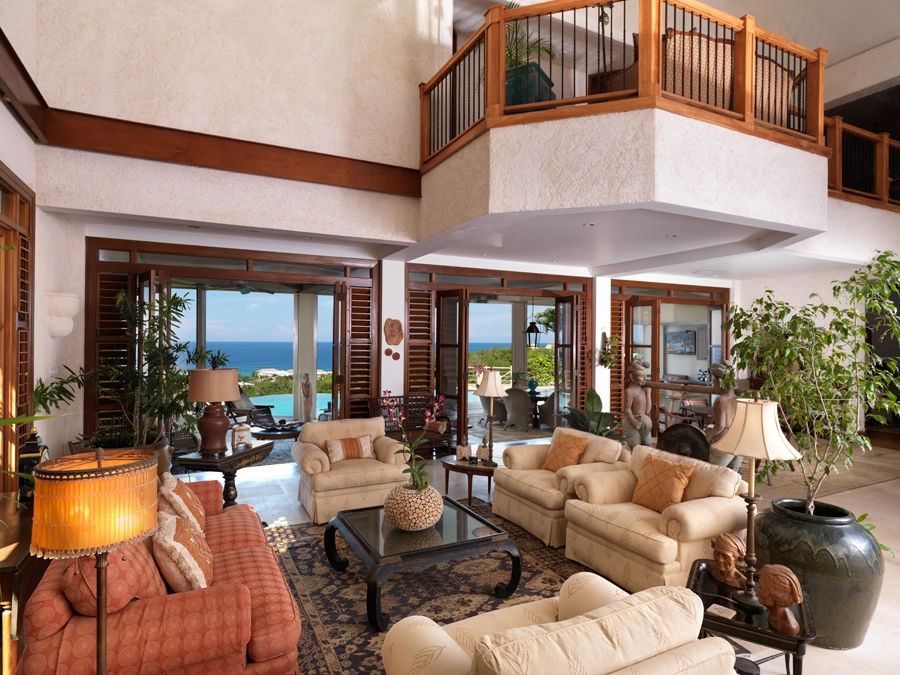 The view is breathtaking ~ the deep blue sea to the north and magnificent mountains to the south. Here is the marriage of exquisite taste, beauty and comfort ~ floors of French limestone, Travertine marble and exotic pressed bamboo; walls of Barbadian coral stone and Venetian glaze. The details are immaculate and artistic. Furnishings are an exquisite combination of Asian antique and tropical colonial. Grounds are lush in orange and lime trees, avocado, papaya, mango, breadfruit, Poinciana, flame trees and delicate orchids.
