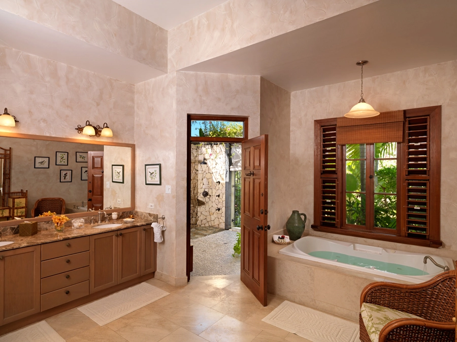 2 Queensize beds, en-suite bathroom with double vanity, whirlpool bath, seat in large shower for guests with disabilities, open-air Swedish drench shower/massage area, 19th Century armoire, English faux-bamboo antique desk, closet safe, cable TV, remote control air conditioner, ceiling fan, opens to porch, sea view and garden, connecting passage to Master Bedroom 1 (Main floor 552 sq ft)