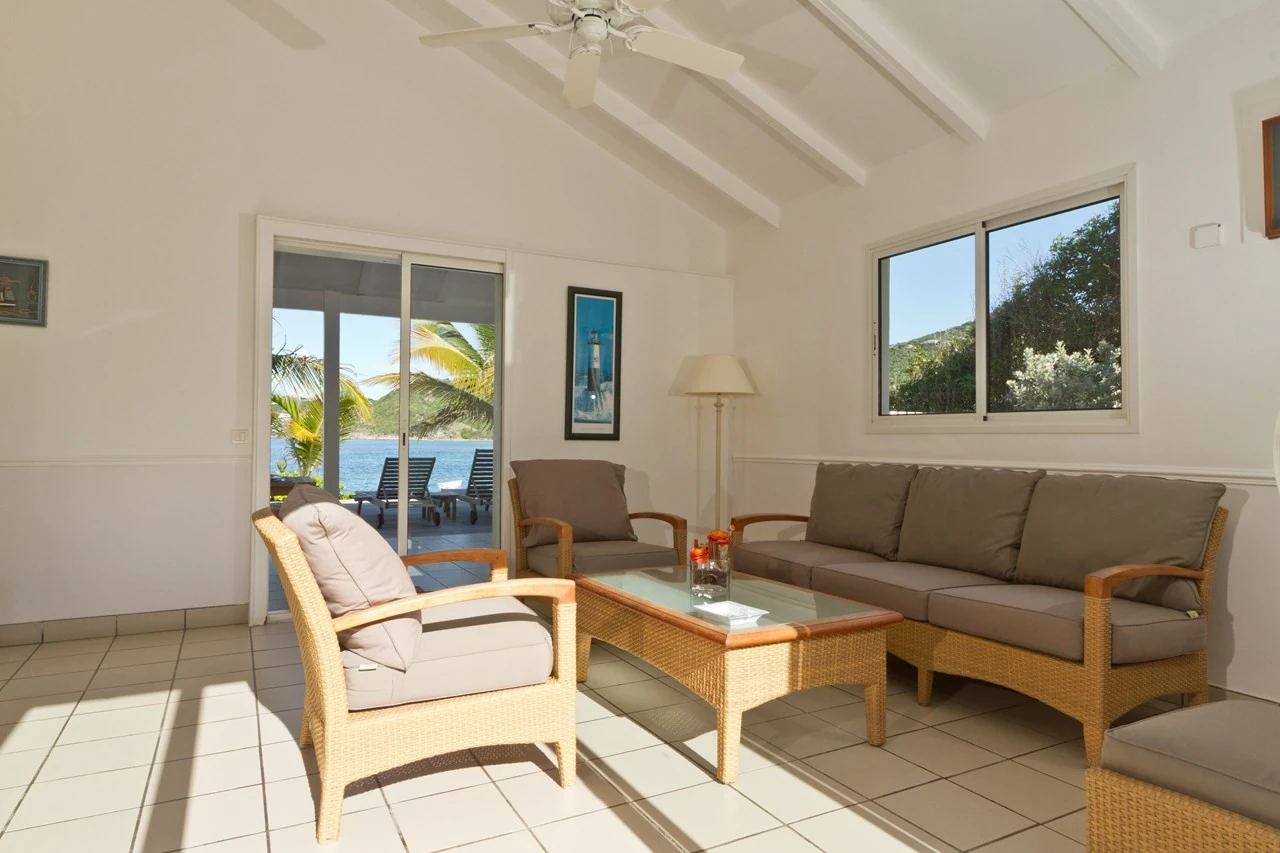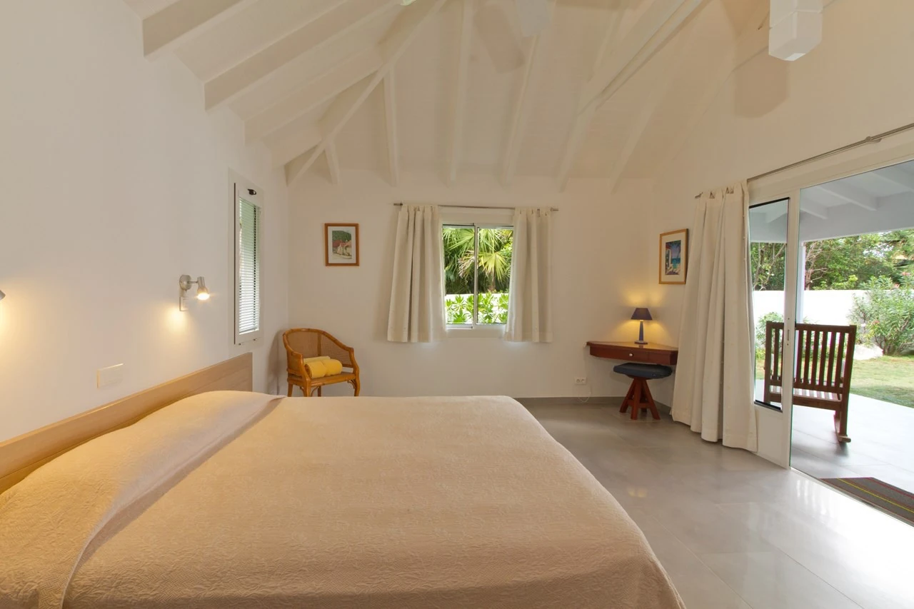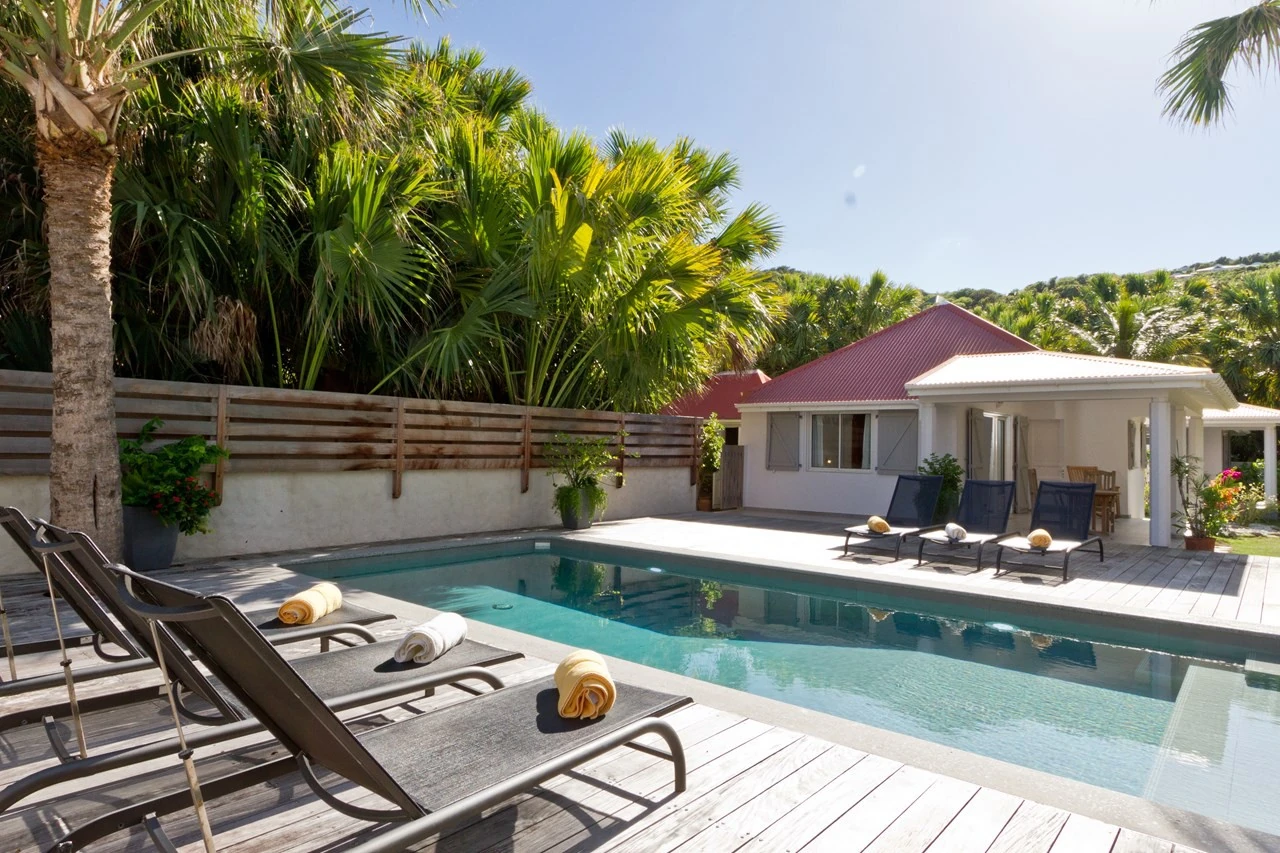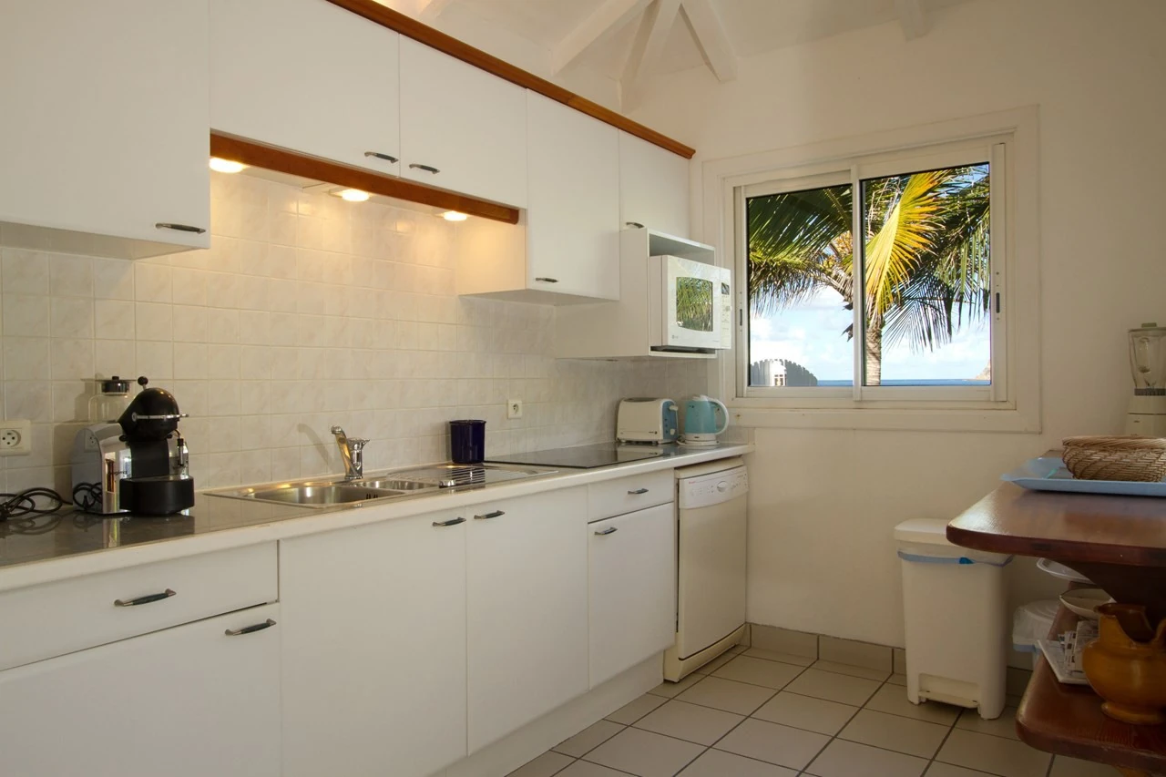 This villa has separate bungalows set back from the road. Each bungalow has its own kitchenette (in addition to the main, well-equipped kitchen). The living room is located in a separate bungalow and opens to a terrace on each side with one terrace facing the beach and the other facing the deck around the pool.