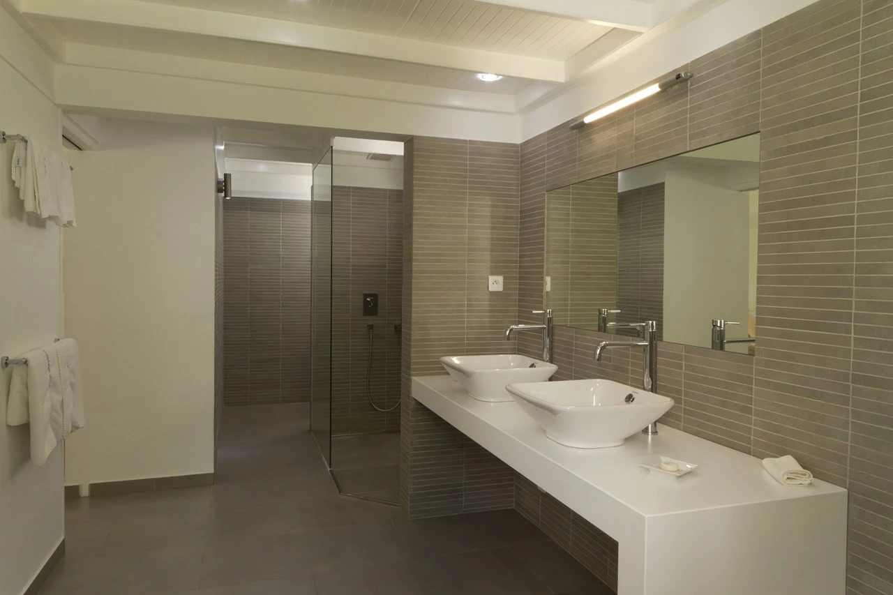 The main bedroom has a king-size bed and en suite bathroom. This bedroom is located close to the pool. The second bedroom has a queen-size bed, an en suite bathroom, and an additional day bed.