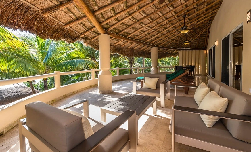 An exterior stairway goes up to the beautiful palapa-topped rooftop Master Bedroom. This is probably the most romantic room, featuring a private furnished deck and elevated views of the Caribbean on one side and lush tropical Jungle on the other.