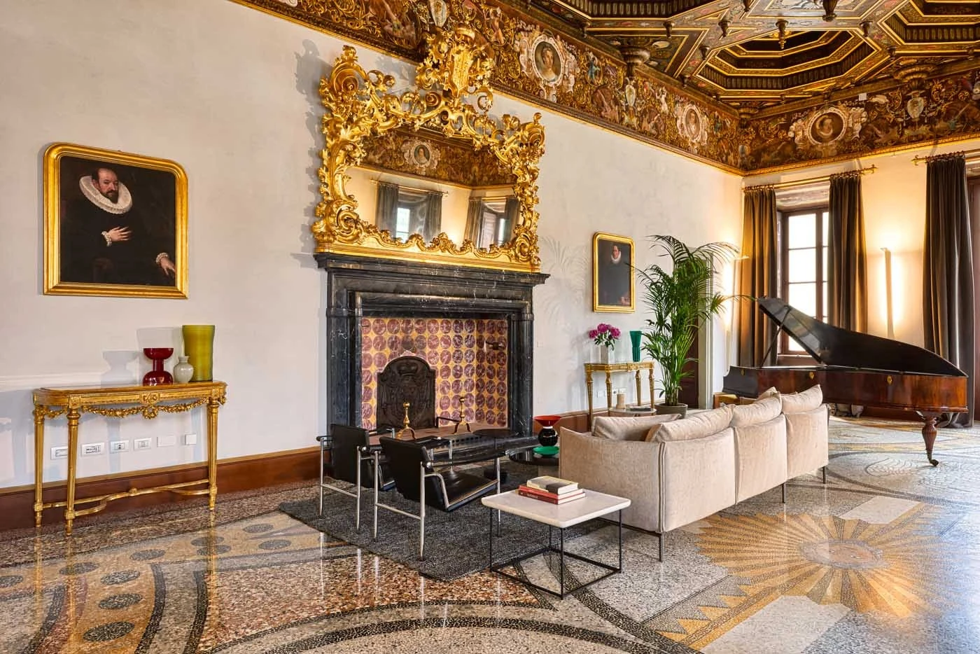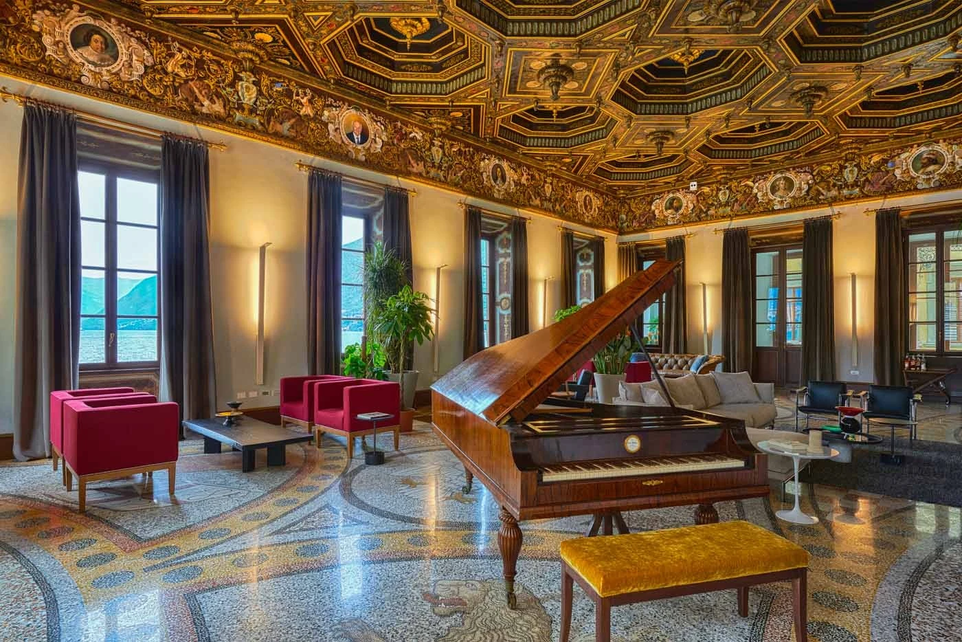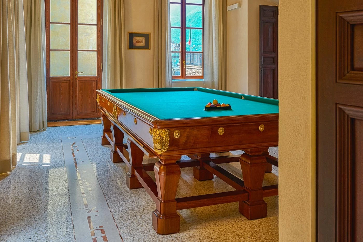 The main spaces dedicated to social interaction are two stunning grand salons. These rooms boast excellent original architectural details that evoke the majesty of the Renaissance era. The original decor has been recently restored with great care and excellent craftsmanship: coffered ceilings, historical painted bands, stuccos, massive French doors facing the astonishing scenery of the Lake. The furniture is a mix of modern and traditional pieces blended in perfect harmony to ensure the highest standards of comfort. Also on this floor are the billiard room, formal dining room, and commercial kitchen (this last one can be used only by the staff). A staircase connects the main floor with the upper floor, where the bedrooms are located. An elevator connects all floors with the parking lot. Indulge in the luxury of the villa interiors and you may never want to leave.