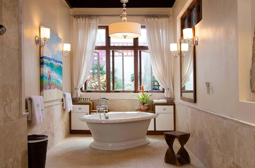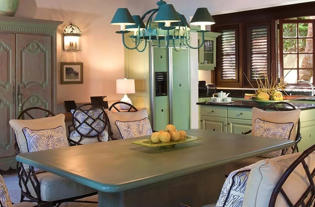 The home’s interiors are colorful and inventive, featuring classic Caribbean furnishings, hand-selected decorative accessories, vibrantly accented upholstery and bed dressings, and unique artwork.