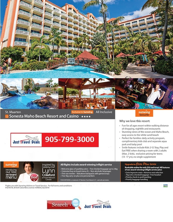 Located on the island's southwest shore in the centre of Maho Village is the all inclusive Sonesta Maho Beach Resort and Casino. Along with a daily activity program and complimentary kids club, the resort also offers a large pool with cascading waterfalls, a spa, fitness facility and a casino. The elegant rooms and suites feature modern amenities such as air conditioning, flat screen TVs, mini bar (stocked with soft drinks, beer and water), safes, complimentary Wi-Fi and private balconies or terraces. Guests can choose from several restaurants that serve grilled specialties, Italian cuisine, and all-day buffets. There are numerous bars and lounges to relax in on site, plus vacationers can enjoy complimentary use of the facilities at the nearby Adults Only Sonesta Great Bay Beach Resort, Casino and Spa (transportation is not included).