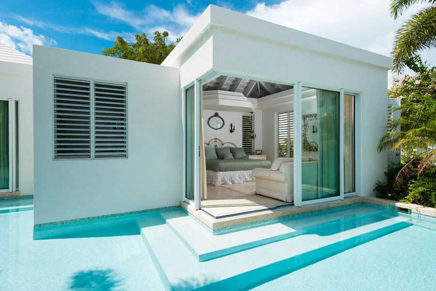 The outdoor living oasis at the center of each Pearl is called the lagoon area. Each lagoon has two beautiful decks for al fresco dining, a pool and waterfall, as well as well as designer patio beds that are perfect for surveying the regal palms and Caribbean flowers that surround them. These lagoons are also the location of gourmet, al fresco covered kitchens, equipped with custom-built Tepanyaki, BBQ, side burners, ice maker, two fridges, two small wine coolers and a cocktail machine. These dreamy lagoons are perfect for enjoying starlight suppers, cocktail hours, or fun-filled family time.