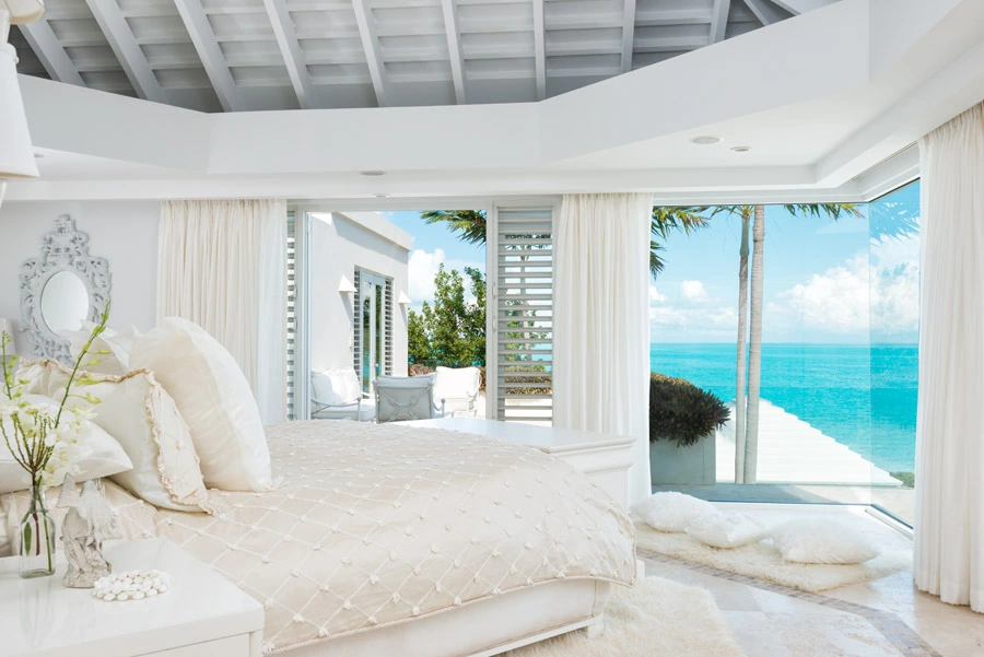 Any of the eight stunning bedrooms—each with an en-suite bathroom—that 'The Pearls' offer across their multiple split levels capture the magical beauty of the Turks & Caicos Islands.The beautifully-appointed and spacious oceanfront master takes up the entire top floor. The remaining seven guest bedrooms, likewise luxuriously-appointed, also offer dual sinks, a private water closet, shower, ceiling fans, air-conditioning, a 55-inch, flat-screen TV, Apple TV, Netflix, WiFi, a safe and a fridge.