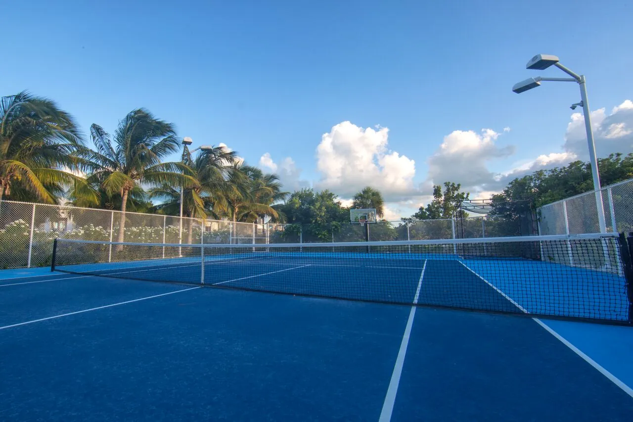 Shared tennis court and basketball hoop