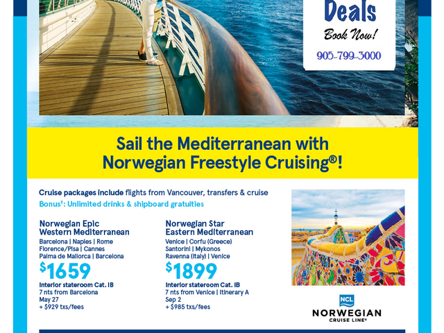 Book a Norwegian Cruise Line cruise and take special discounted pricing in Canadian dollars on hundreds of sailings. And combine this offer with our CruiseAir BOGO Sale to get up to $250 in additional savings! |