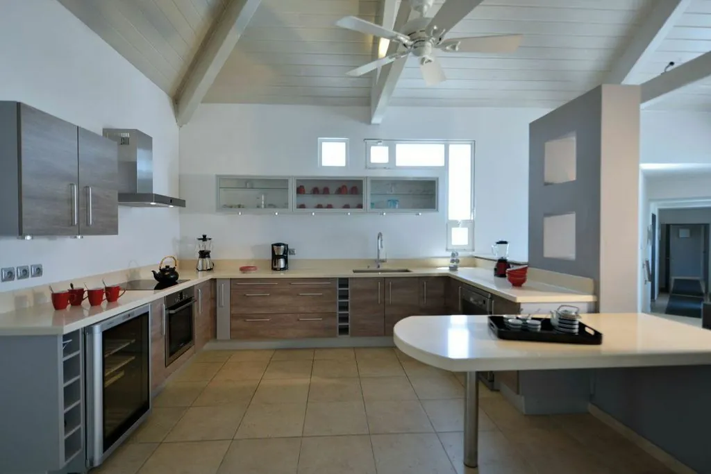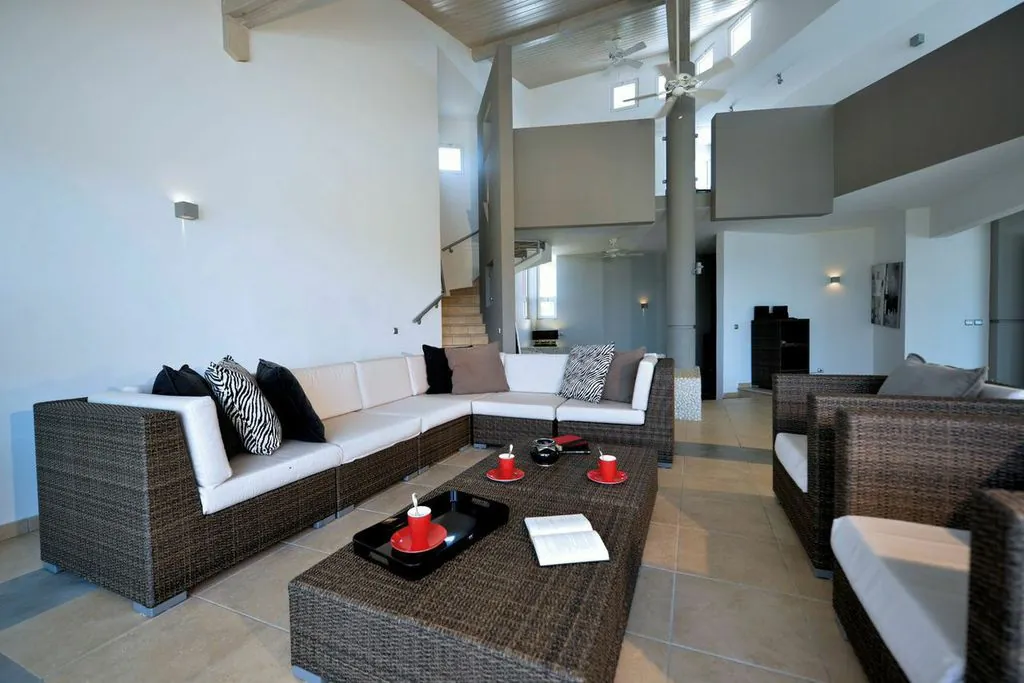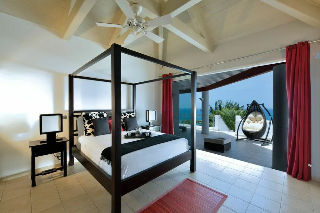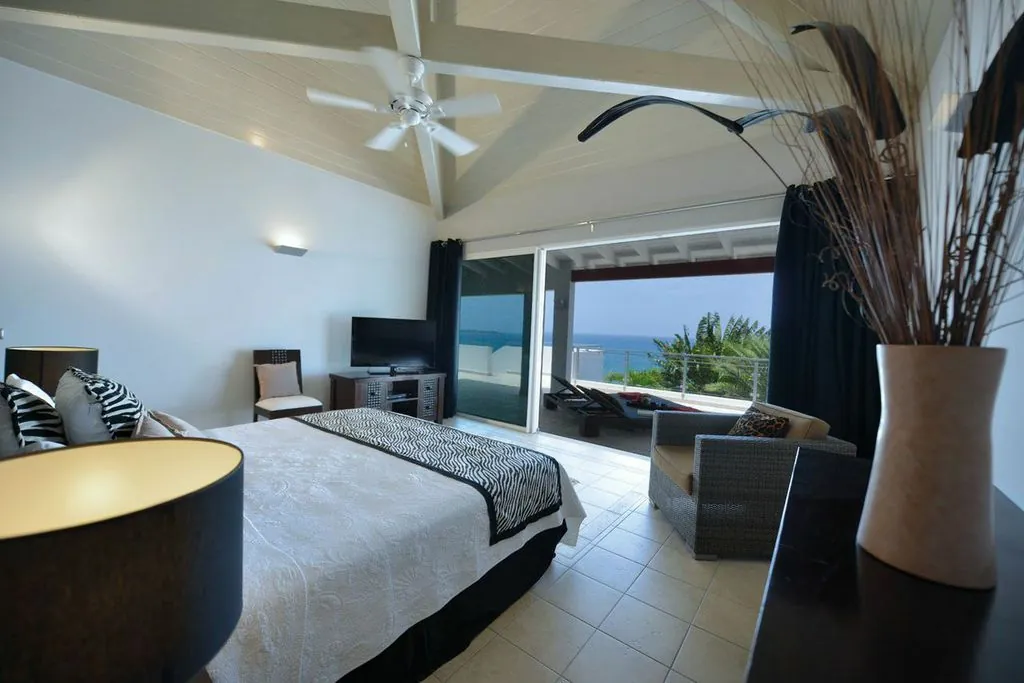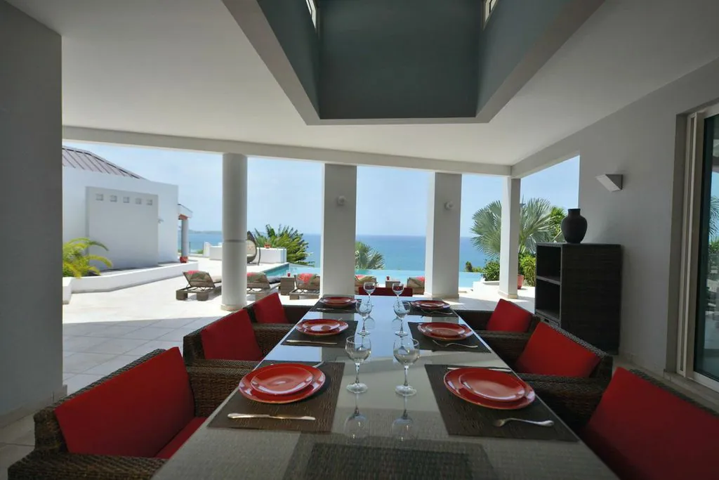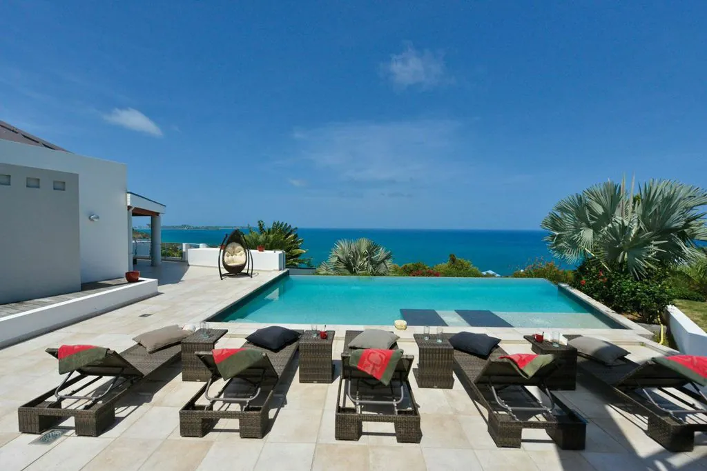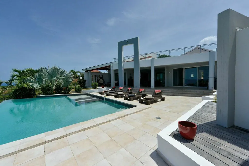 Book your next dream vacation staying at the luxury five bedroom Villa Belle De Nuit Villa S Martin. Villa Belle De Nuit on the hillside above Happy Bay beach is an architectural gem.